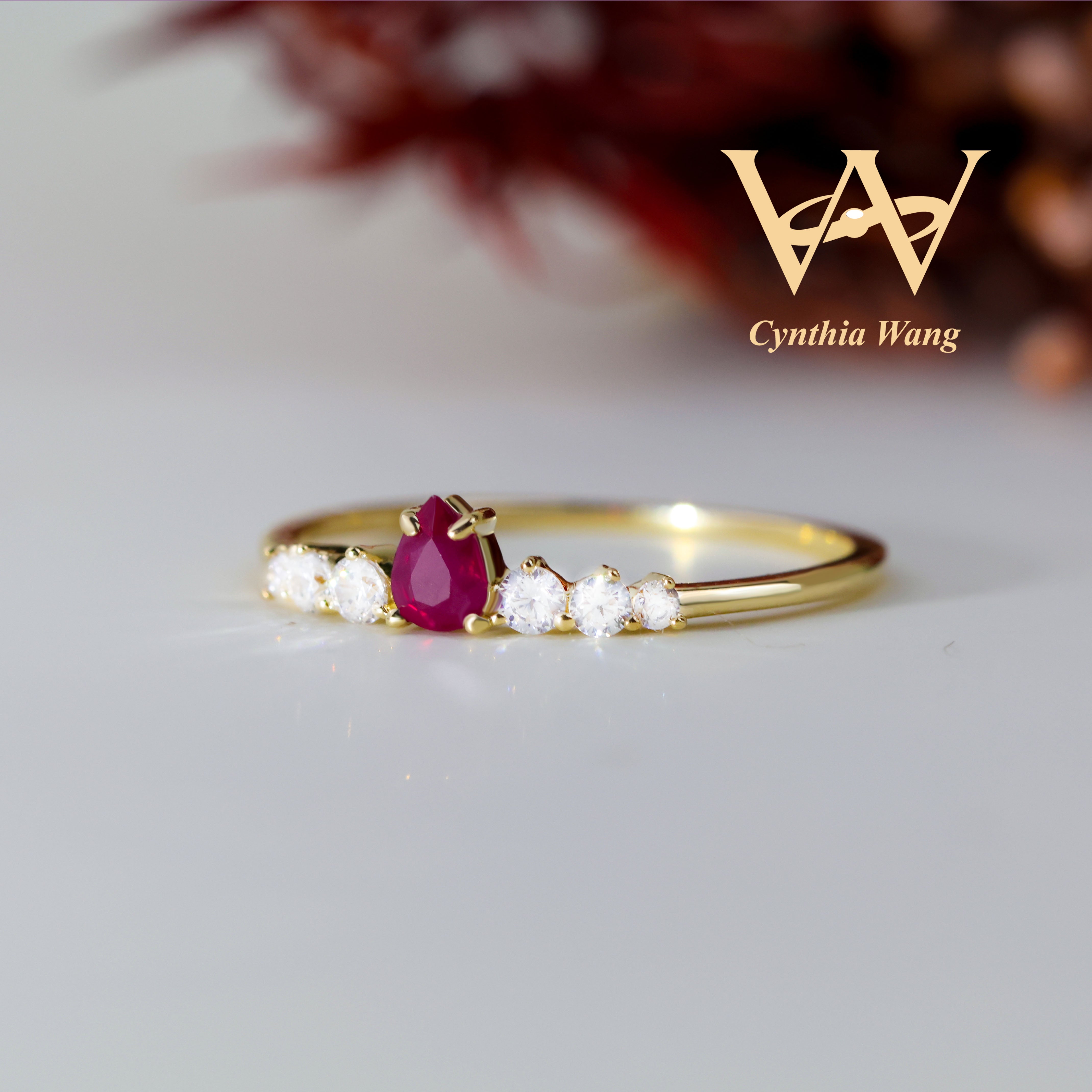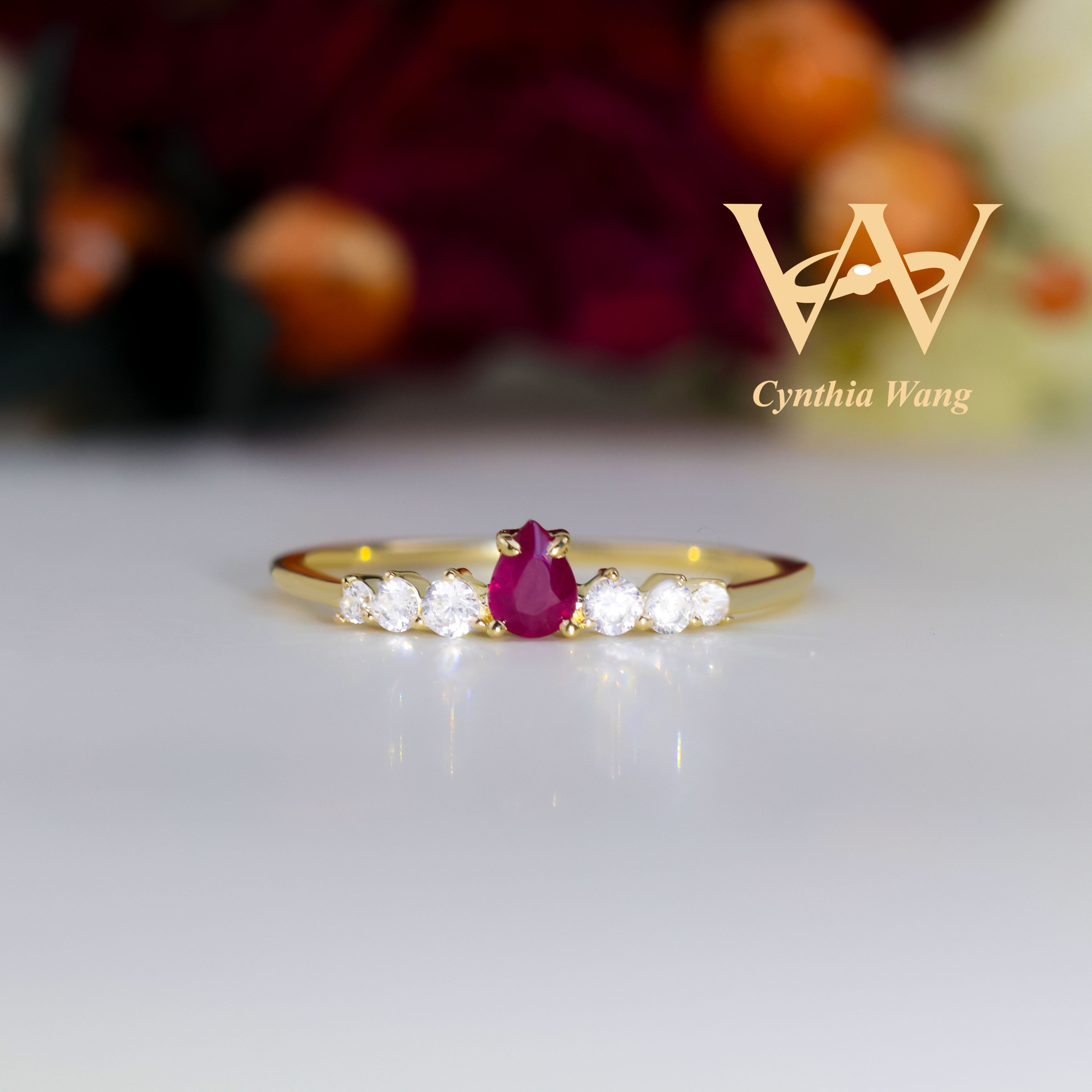 Indulge in the captivating allure of 'Crimson Fantasy'. Crafted from lasting 10k gold, this ring features a beguiling pear cut ruby, radiating timeless charm and irresistible temptation. Elevate your style with this exquisite piece that will never fade.