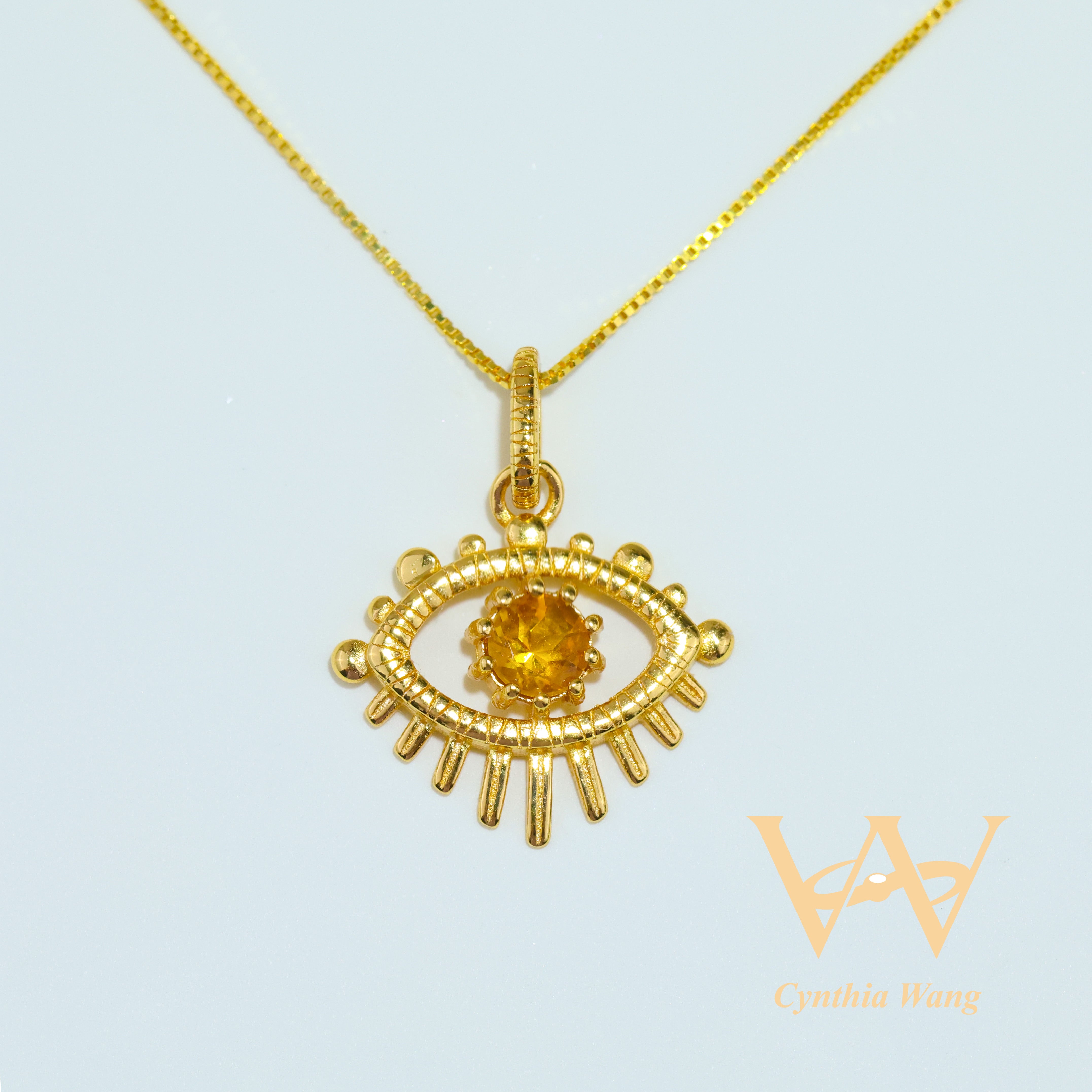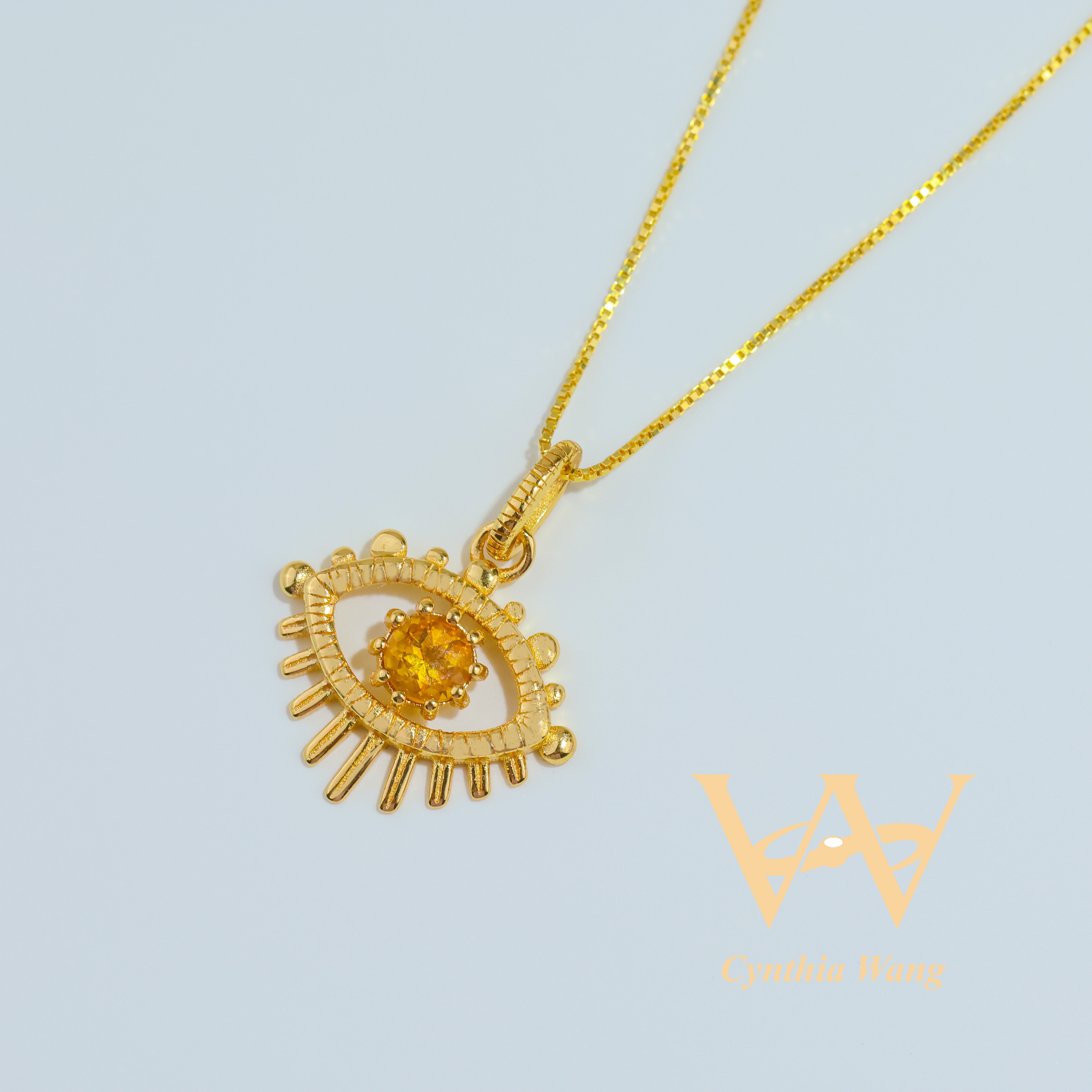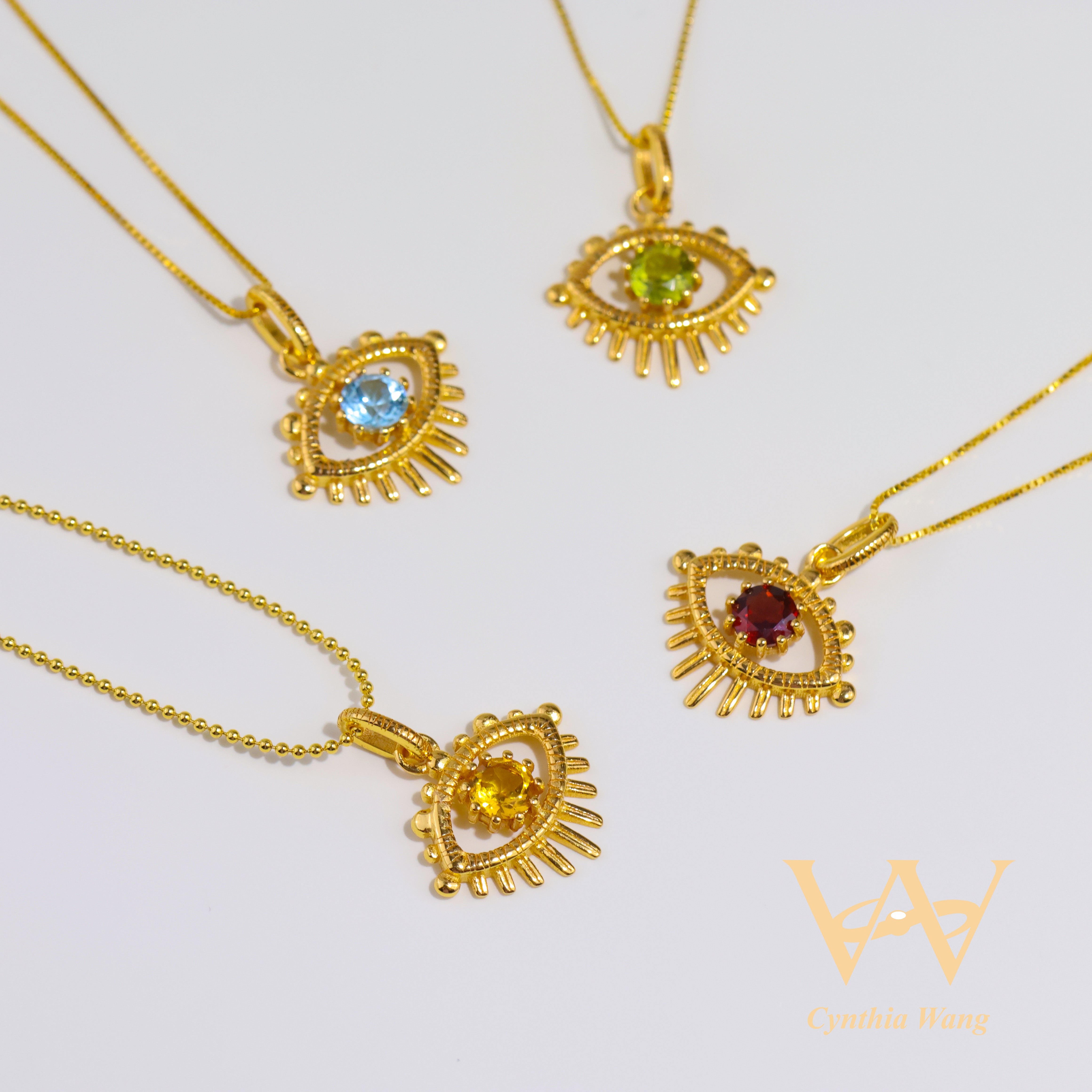 Indulge in the mystical allure of our 'Evil Eye' Gems Pendant. With its intricate design featuring 18k gold plating and a round cut Citrine, Peridot, Garnet, Topaz, this piece exudes an irresistible charm. Let your inner divinity shine with this exclusive pendant that is both alluring and enigmatic.