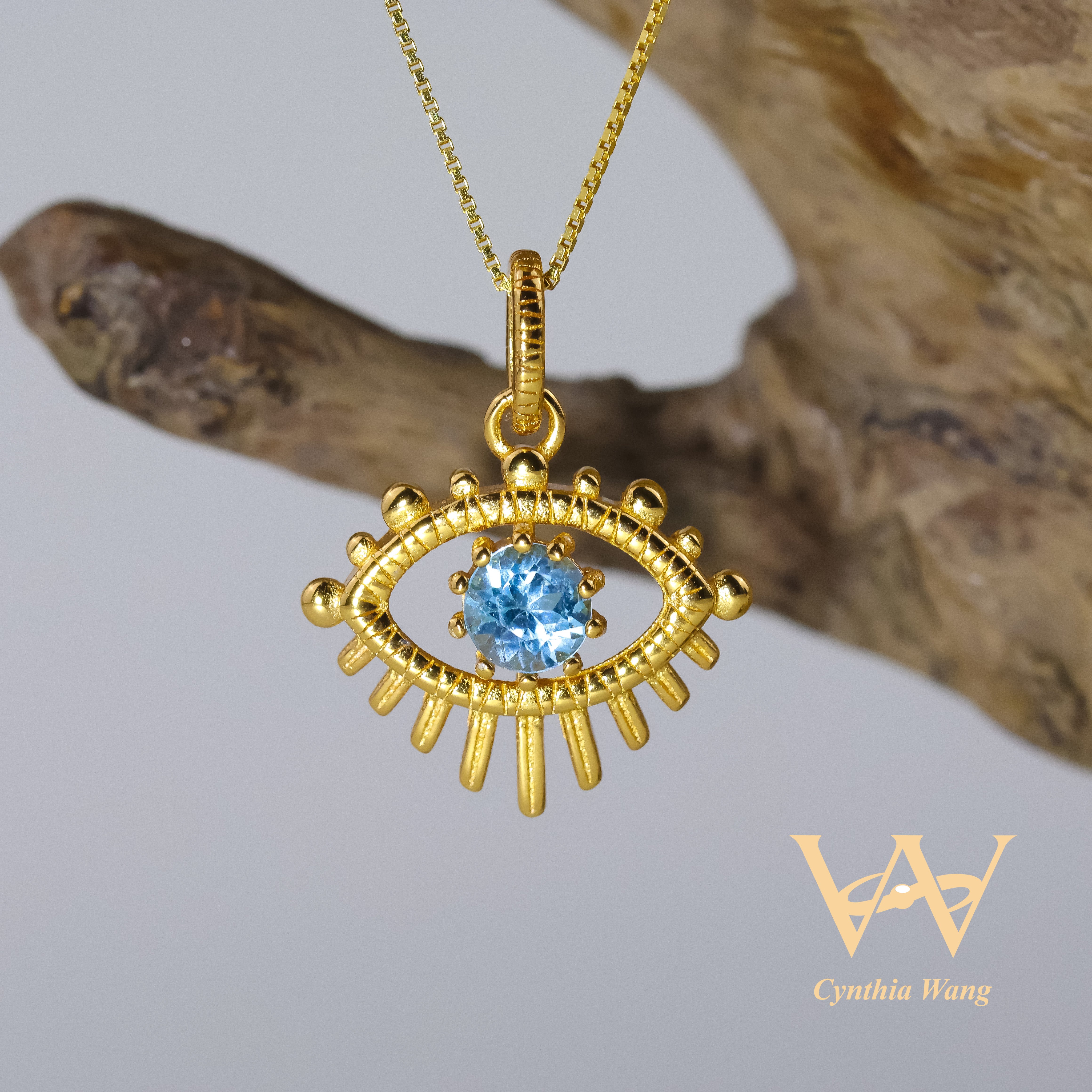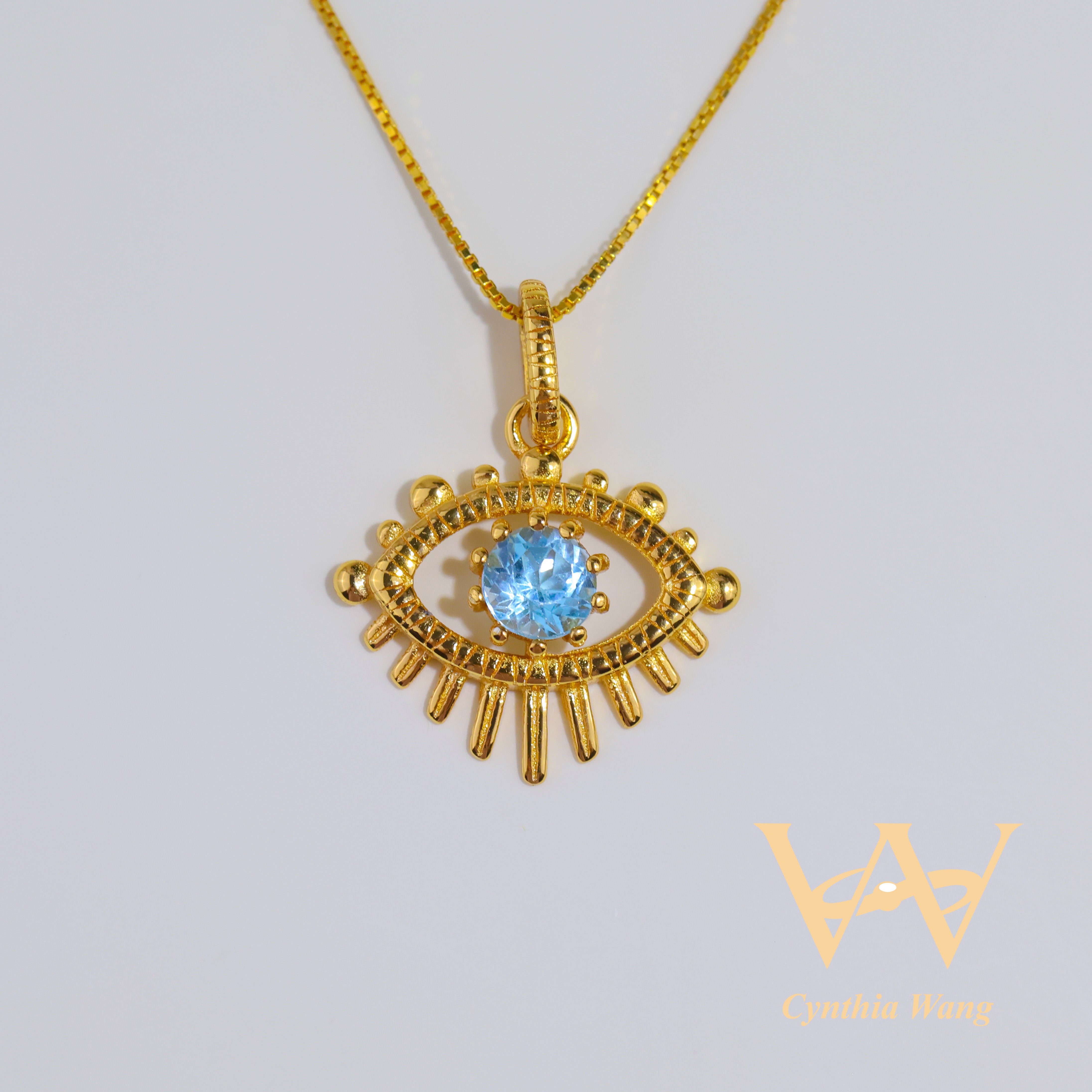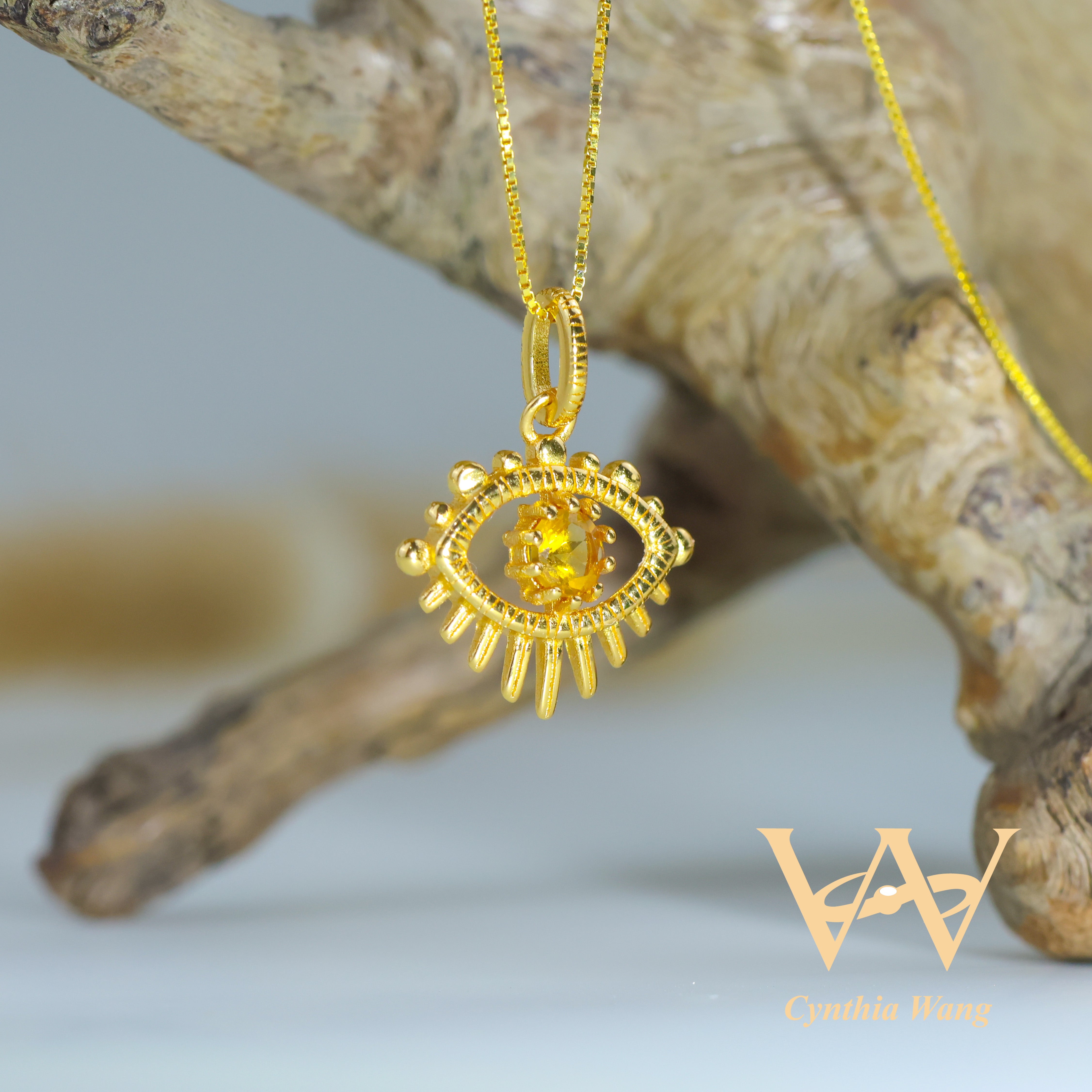 Indulge in the mystical allure of our 'Evil Eye' Gems Pendant. With its intricate design featuring 18k gold plating and a round cut Citrine, Peridot, Garnet, Topaz, this piece exudes an irresistible charm. Let your inner divinity shine with this exclusive pendant that is both alluring and enigmatic.