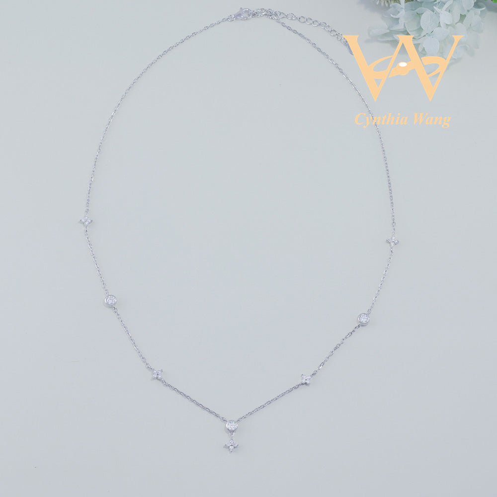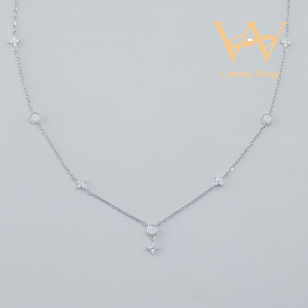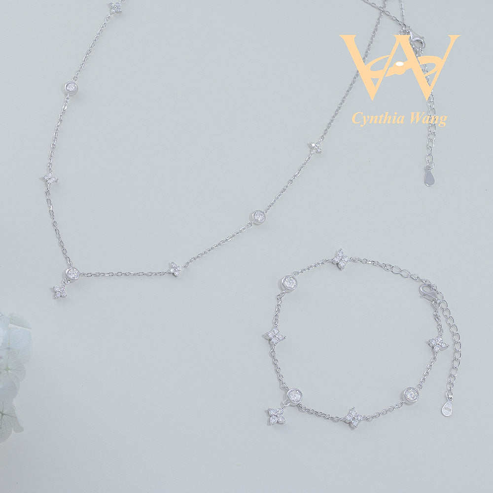 Crafted from premium s925 sterling silver, the 'Luck Star' jewelry set features a delicate four-leaf clover design adorned with scattered moissanite stones. Each gem sparkles brilliantly, adding a refined touch of elegance and charm to your ensemble. This necklace and bracelet duo embodies timeless sophistication, perfect for elevating any look with subtle yet captivating brilliance.