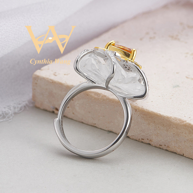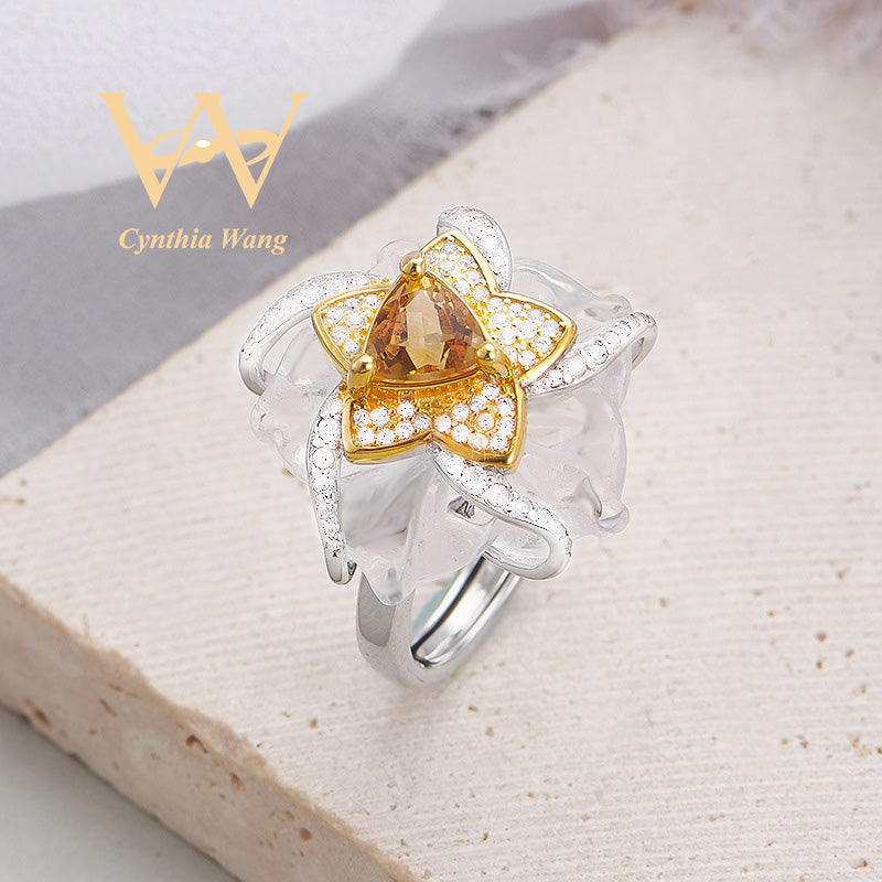 Indulge in the exquisite beauty of our 'Brilliant Bloom' Citrine & Clear Quartz Ring. Crafted with high-quality s925 material, the stunning flower design features intricately carved clear quartz petals held in a silver setting, with a sparkling citrine center and shimmering zircon accents. A truly rare and dazzling treasure for the discerning collector.