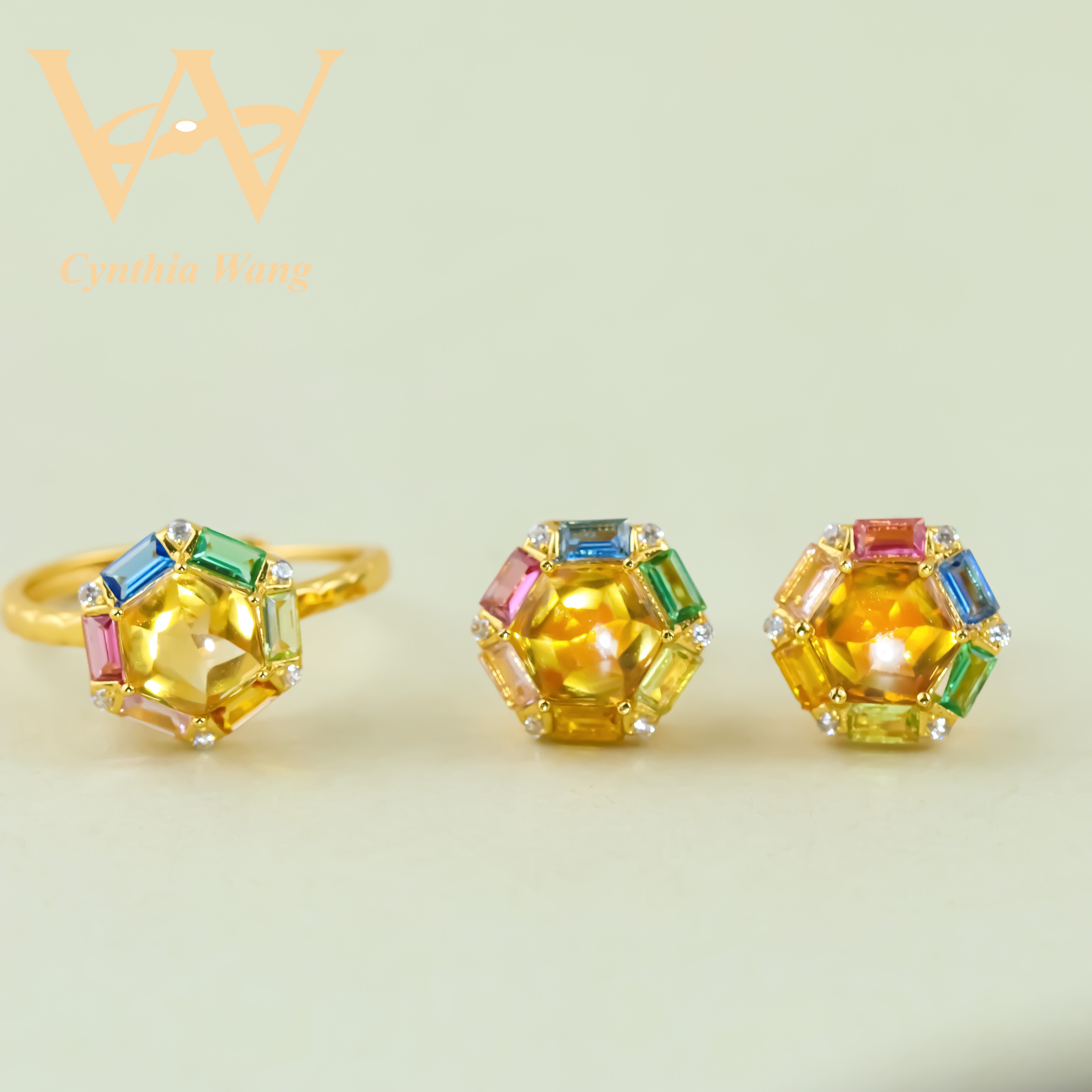 Indulge in the luxurious charm of our 'Magic Box' Citrine Ear Studs & Ring Jewelry Set. Inspired by the hope and power found in a hexagonal magic box, the colorful cubic zirconia surrounding the citrine stone exudes elegance and sophistication. Elevate your collection with this fashion-forward design.