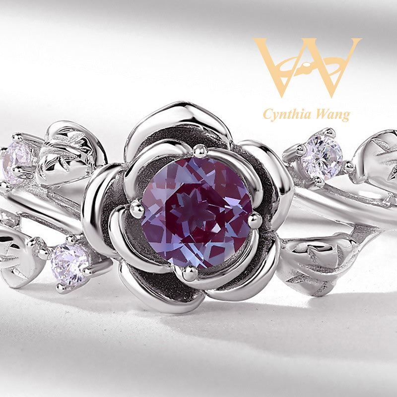 Indulge in luxury with the 'Thorn Rose' Alexandrite Ring. Crafted with s925 sterling silver, this ring features a stunning round cut Alexandrite stone in a unique and alluring 'Thorn Rose' design. The enchanting color of the stone adds a touch of mystery and romance, making it a perfect addition to any collection.